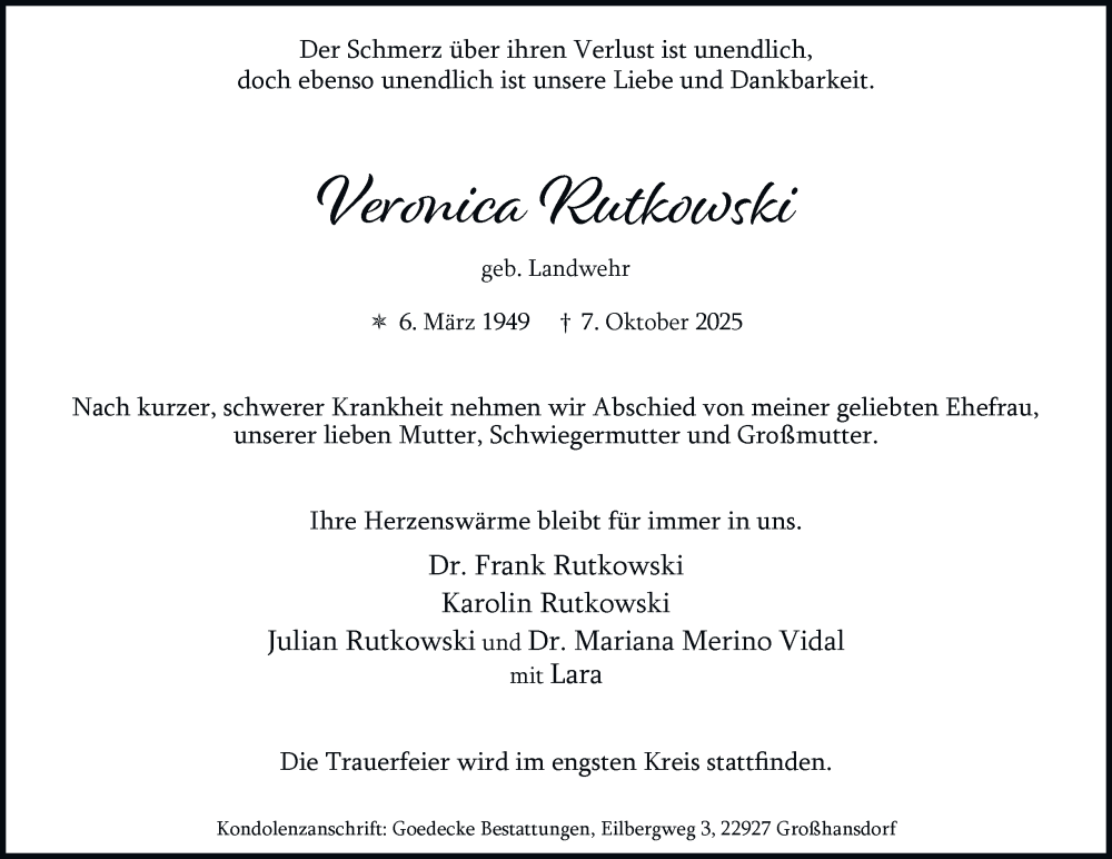 Hier finden Sie alle Traueranzeigen aus der Zeitung, die bisher für Veronica Rutkowski erschienen sind. Weitere Traueranzeigen, die in der Zeitung erscheinen, werden hier ebenfalls aufgelistet