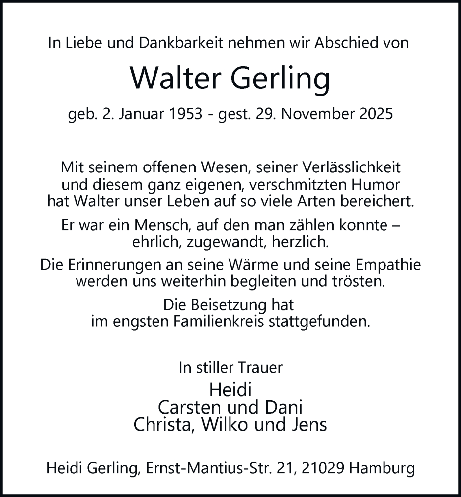 Hier finden Sie alle Traueranzeigen aus der Zeitung, die bisher für Walter Gerling erschienen sind. Weitere Traueranzeigen, die in der Zeitung erscheinen, werden hier ebenfalls aufgelistet
