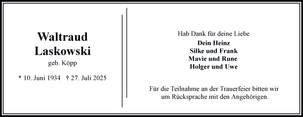 Hier finden Sie alle Traueranzeigen aus der Zeitung, die bisher für Waltraud Laskowski erschienen sind. Weitere Traueranzeigen, die in der Zeitung erscheinen, werden hier ebenfalls aufgelistet