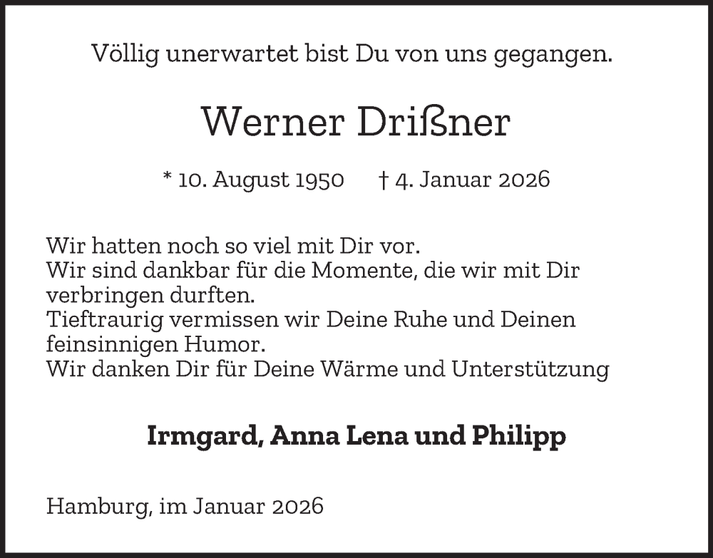 Hier finden Sie alle Traueranzeigen aus der Zeitung, die bisher für Werner Drißner erschienen sind. Weitere Traueranzeigen, die in der Zeitung erscheinen, werden hier ebenfalls aufgelistet
