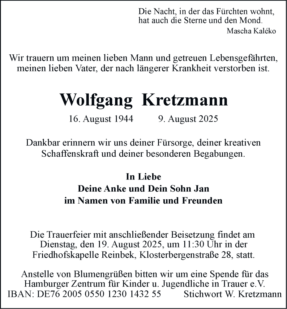 Hier finden Sie alle Traueranzeigen aus der Zeitung, die bisher für Wolfgang Kretzmann erschienen sind. Weitere Traueranzeigen, die in der Zeitung erscheinen, werden hier ebenfalls aufgelistet